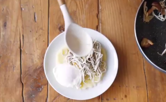 | Revuelto de huevos escalfados, setas y gulas con puré de patatas. |